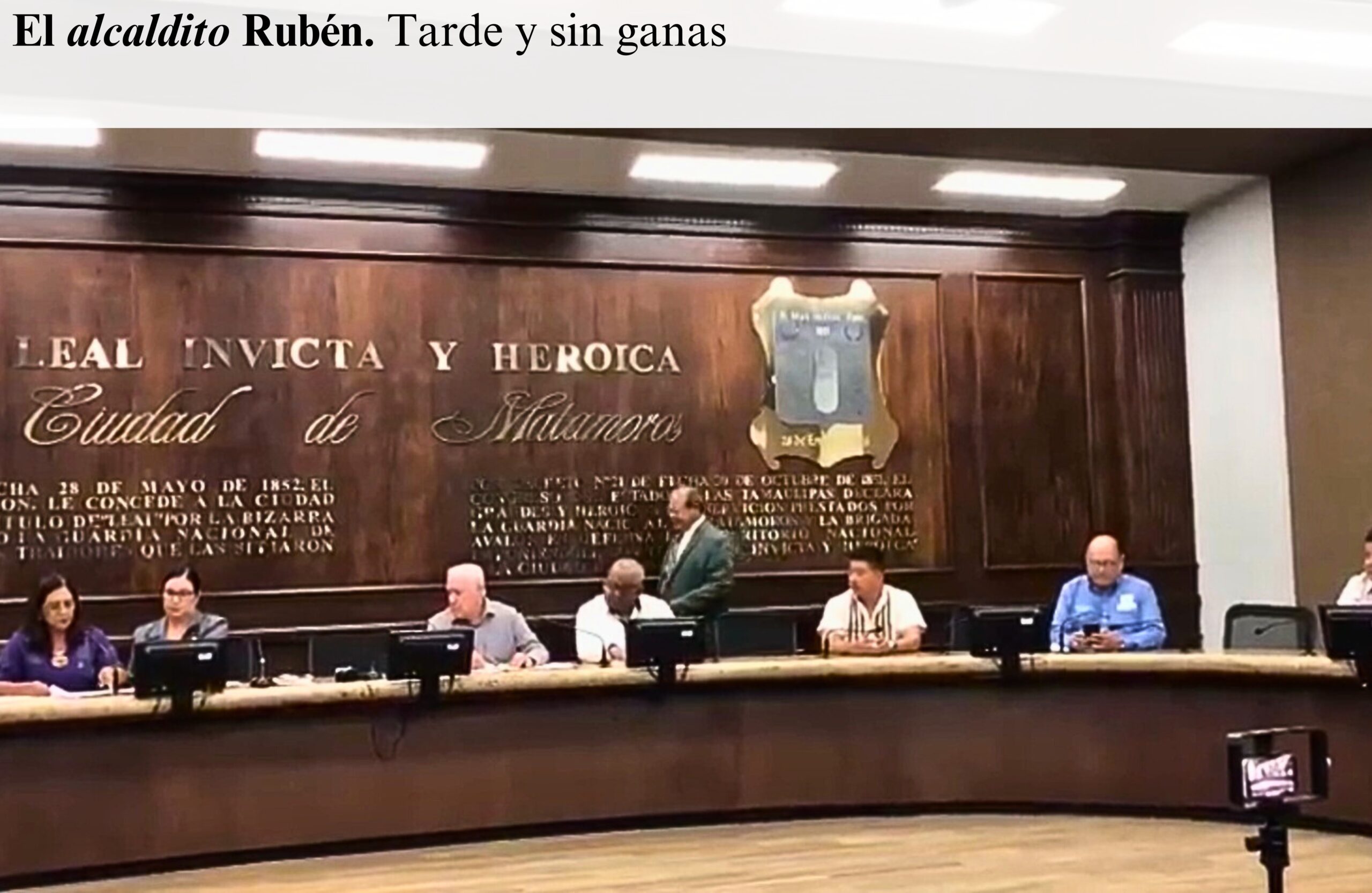 Iban a votar los regidores por la aceptación, cuando llegó a la sala Miguel Sáenz González, el alcaldito Rubén Sauceda, con su termo regalado por personal del Tecnológico de Matamoros, su caminar era como partiendo plaza, despreocupado, como si le debiéramos un favor.
