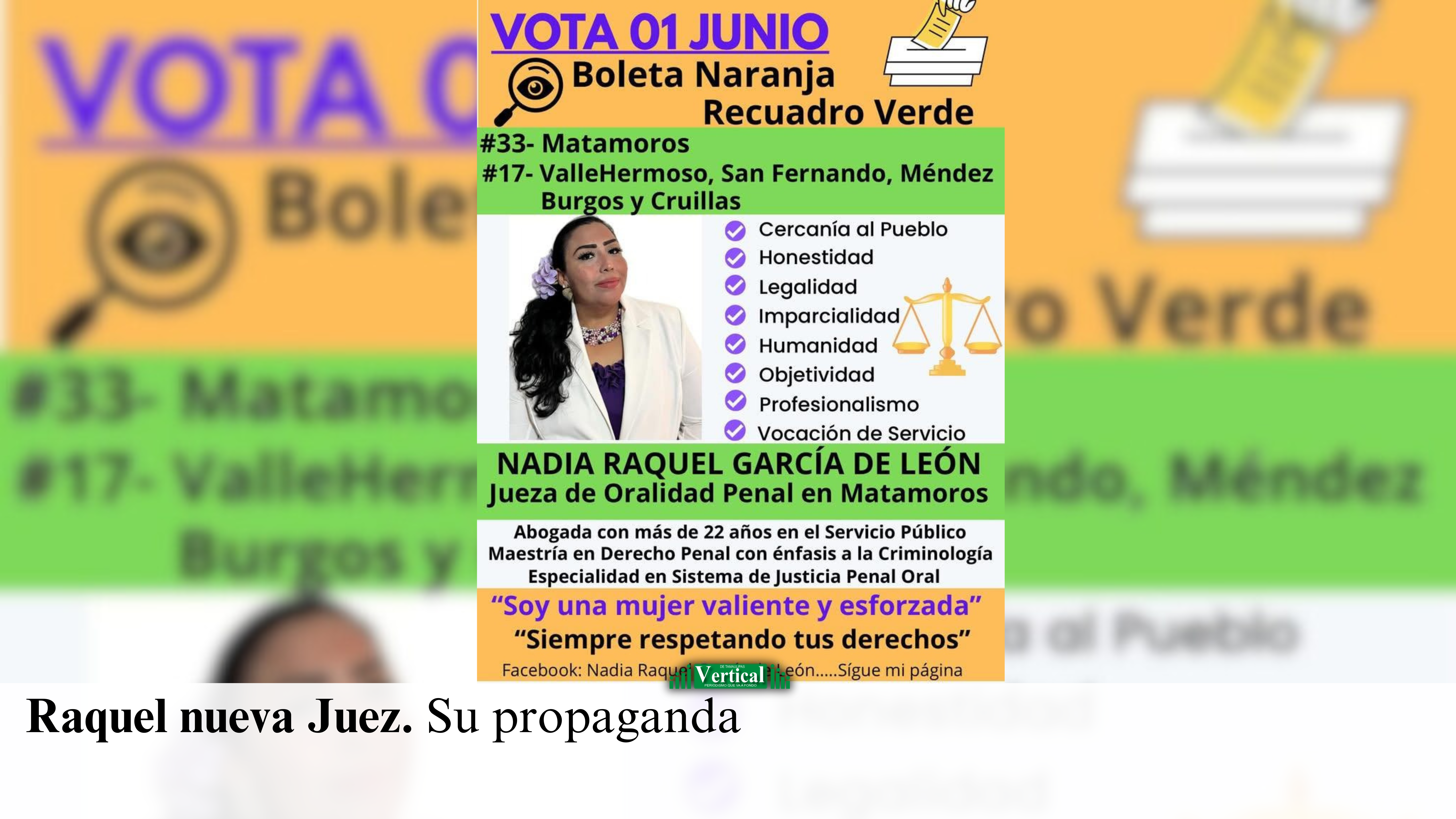 La nueva jueza es Nadia Raquel García de León, con cabecera en San Fernando y Elsa Capitanachi Domínguez, que trabajará en Matamoros, sustituyendo a Christian Osiris Hernández Cortina, el que se distiguió porque como Fiscal le dio vida al Diablo en la carpeta de investigación, cuando supuestamente ordenó a un joven que matara a su papá y ya ascendido como juez, lo sentenció severamente, porque le dijo Dios.