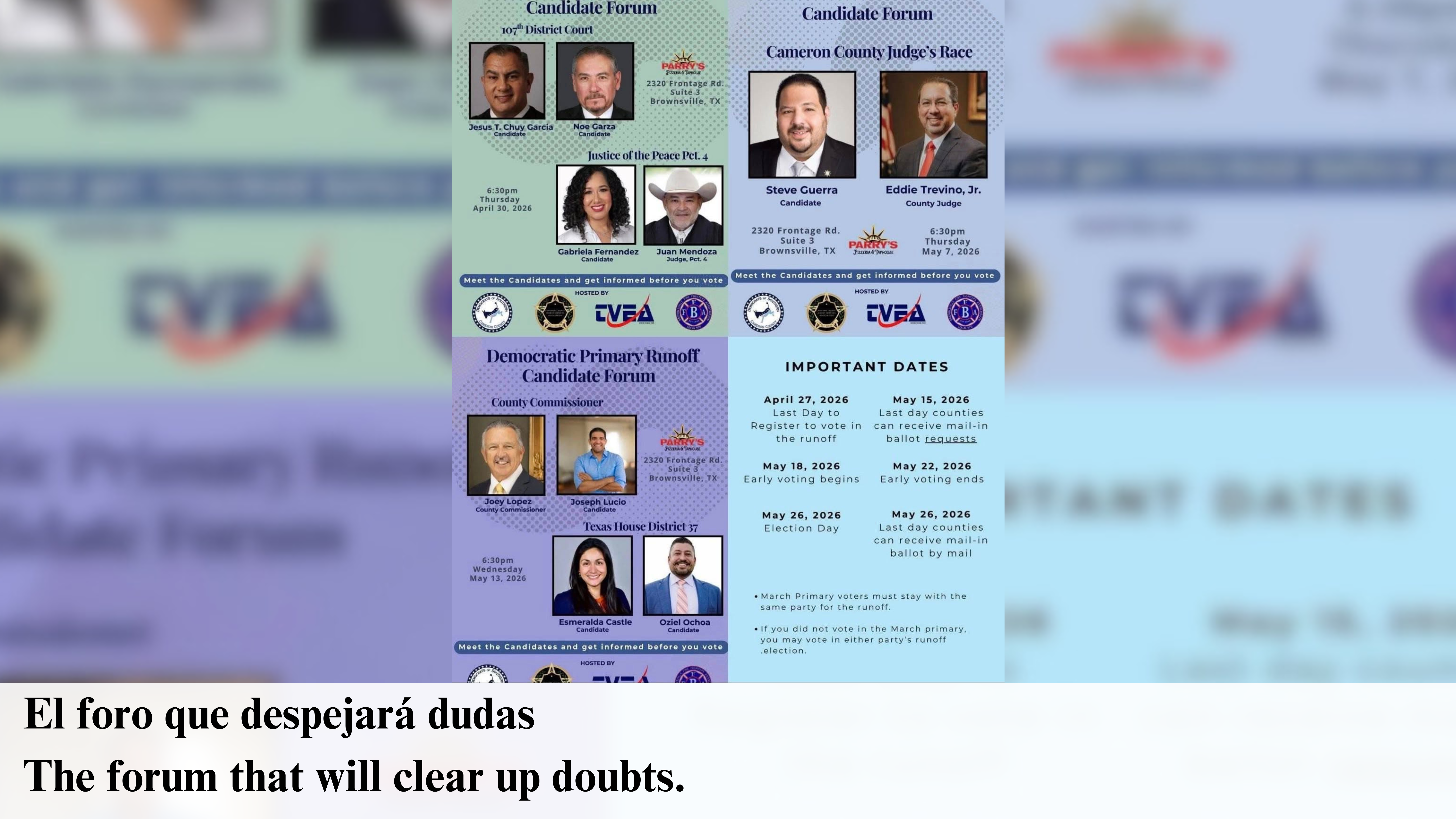 En el marco del proceso electoral rumbo a la segunda vuelta demócrata en el condado de Cameron, se anunció la realización de una serie de foros públicos donde candidatos a distintos cargos locales estarán participando ante la comunidad.
