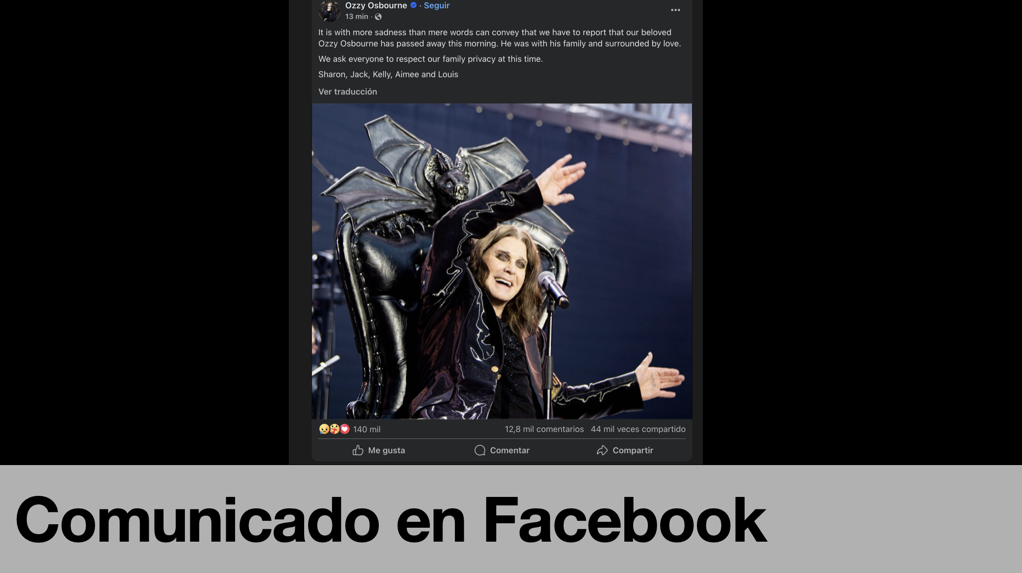 La noticia fue confirmada por su familia mediante un comunicado donde expresaron que el cantante murió “rodeado de cariño” y pidieron respeto a su privacidad, el mensaje provocó una ola global de homenajes y luto entre millones de seguidores que vieron en él una figura irrepetible del rock.