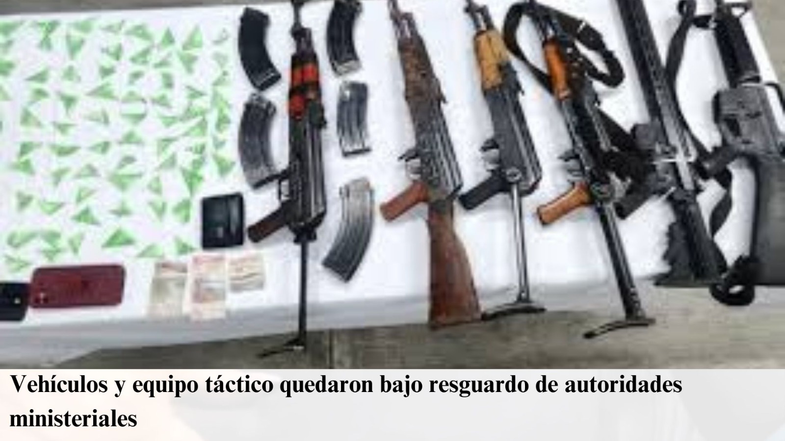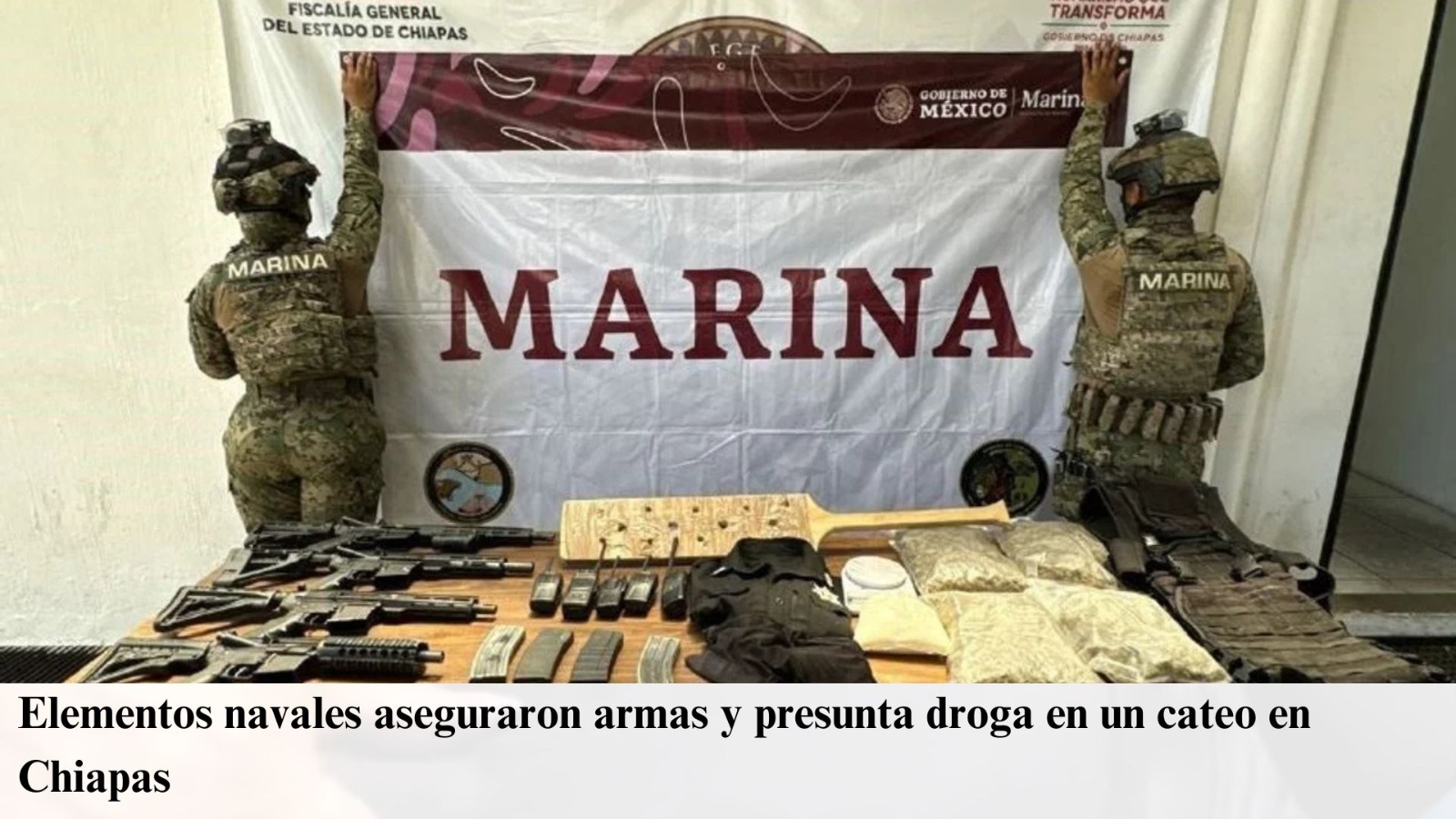 Elementos de la Secretaría de Marina en coordinación con la Fiscalía General del Estado de Chiapas realizaron un cateo en el municipio de Huixtla donde aseguraron armamento equipo táctico vehículos y sustancias con características de droga, entre lo decomisado se encuentran cuatro armas largas cargadores radios portátiles chalecos antibalas motocicletas y una camioneta además de bolsas con hierba similar a la mariguana, todo quedó a disposición de la autoridad ministerial para integrar la investigación correspondiente.