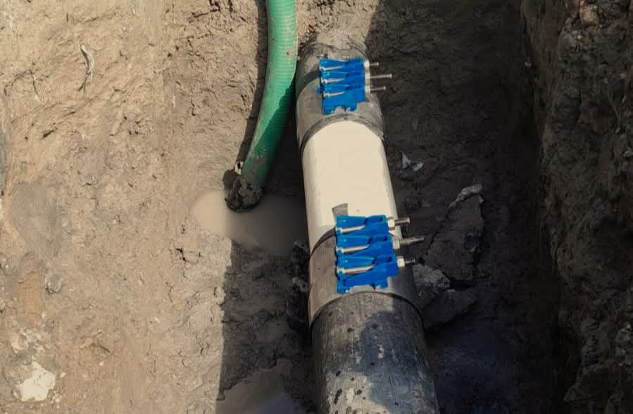 Las cuadrillas trabajaron en la instalación de una abrazadera para sellar la línea dañada y restablecer el servicio de manera eficiente.