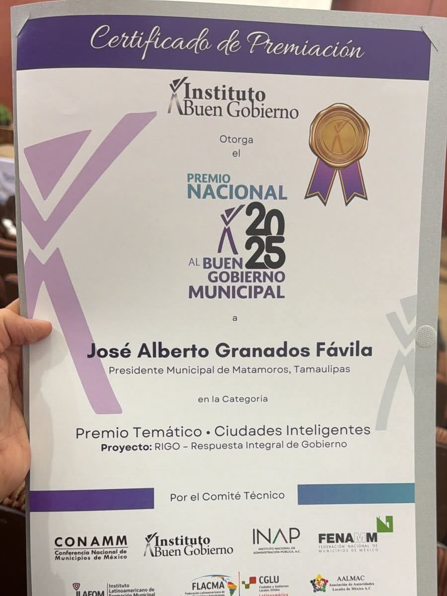 El gobierno de Matamoros que encabeza el Presiddente Municipal Beto Granados, fue distinguido con el Premio Nacional al Buen Gobierno 2025, en la modalidad de Ciudades Inteligentes, gracias al programa Respuesta Integral de Gobierno (RIGO), modelo que ha transformado la atención ciudadana mediante el uso de tecnología y procesos innovadores.