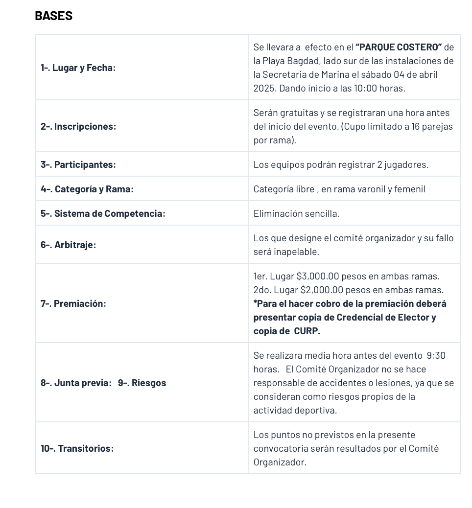 A todos los deportistas y público en general, a participar en su TORNEO RELÁMPAGO DE VOLEIBOL DE PLAYA 2026, el cual tiene como propósito primordial fomentar las actividades deportivas y recreativas entre los vacacionistas, en un ambiente de total convivencia, de acuerdo a las siguientes: