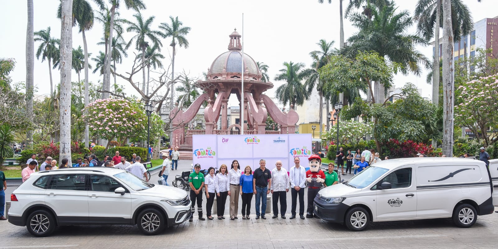 En una significativa ceremonia efectuada en la Plaza de Armas, el Presidente municipal Chucho Nader y su esposa Aida Feres de Nader, titular del Sistema DIF Tampico agradecieron el generoso gesto del corporativo encabezado por el empresario José Ángel García Hernández y sus hijos José Ángel y María de Lourdes García Elizondo.