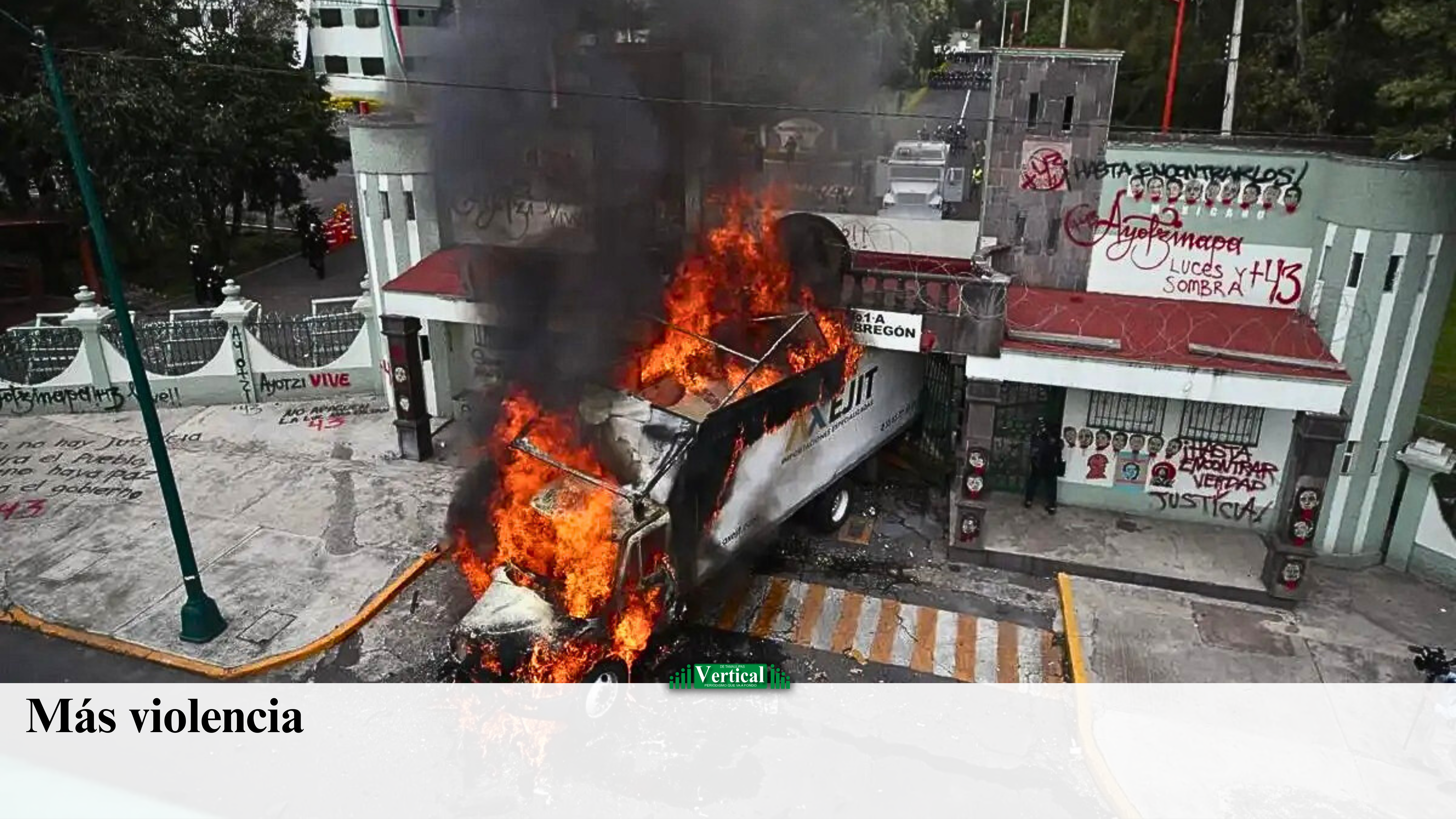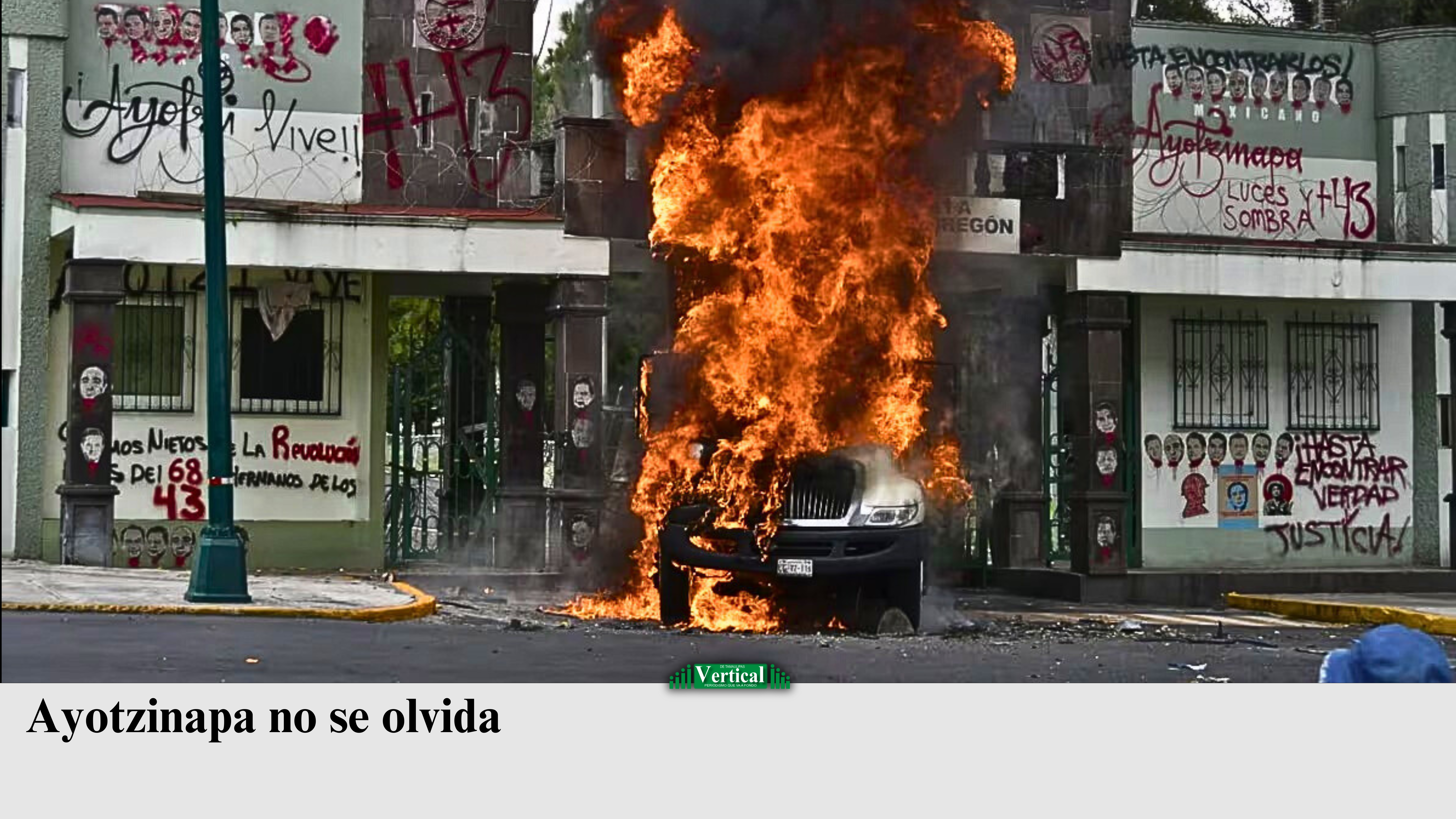 Por la violencia, el vehículo quedó encajado en la entrada del lugar, entre los muros de cemento pintados con mensajes que leen “Ayotzinapa vive” y “Hasta encontrarlos, verdad y justicia”.