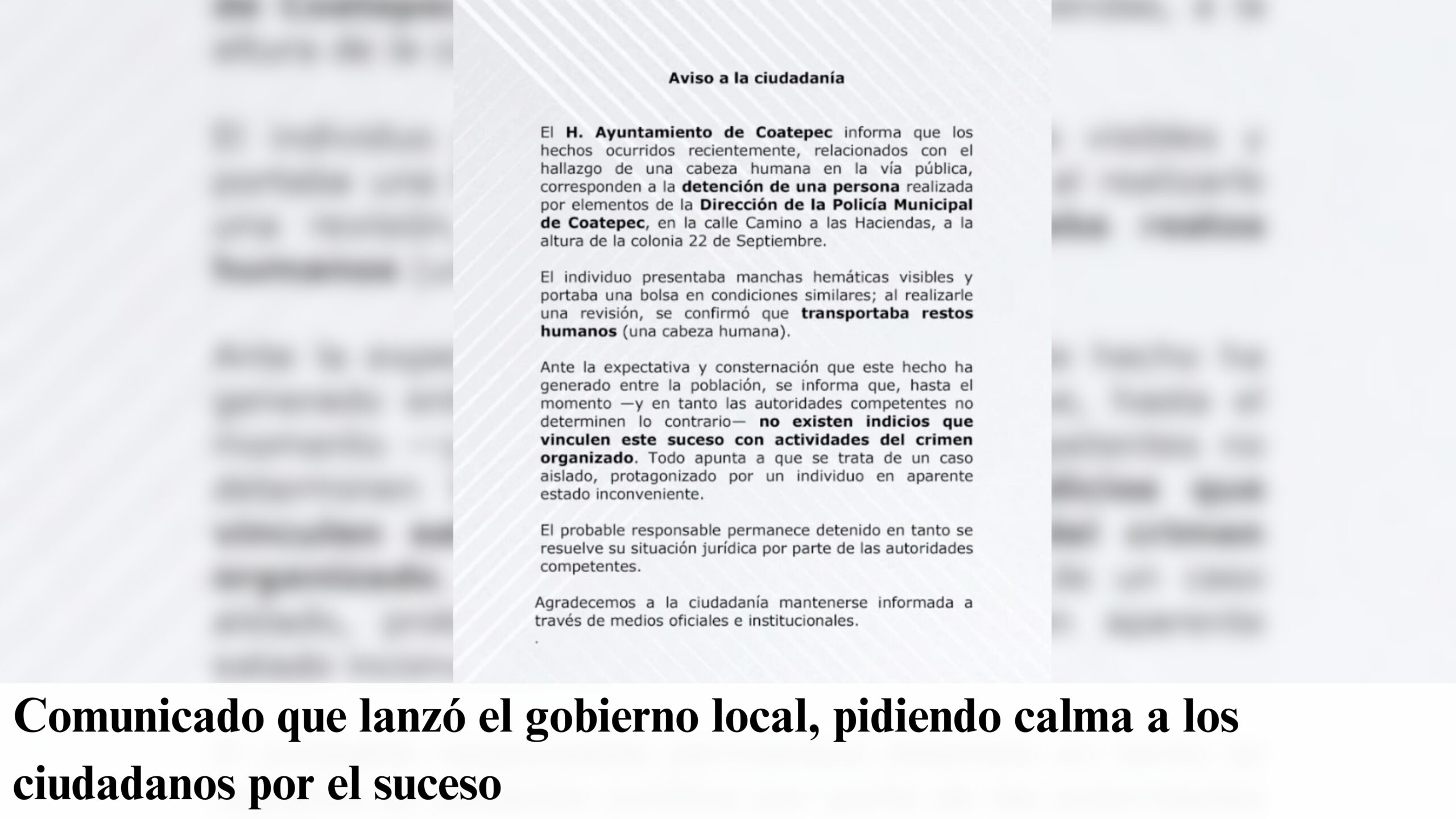 Los uniformados municipales lo interceptaron sobre Camino a las Haciendas, muy cerca de una empresa refresquera, en ese punto, el sospechoso abandonó el cráneo cercenado e intento huir antes de ser capturado sin oponer resistencia. Fue llevado de inmediato a la Fiscalía estatal para su procesamiento legal.