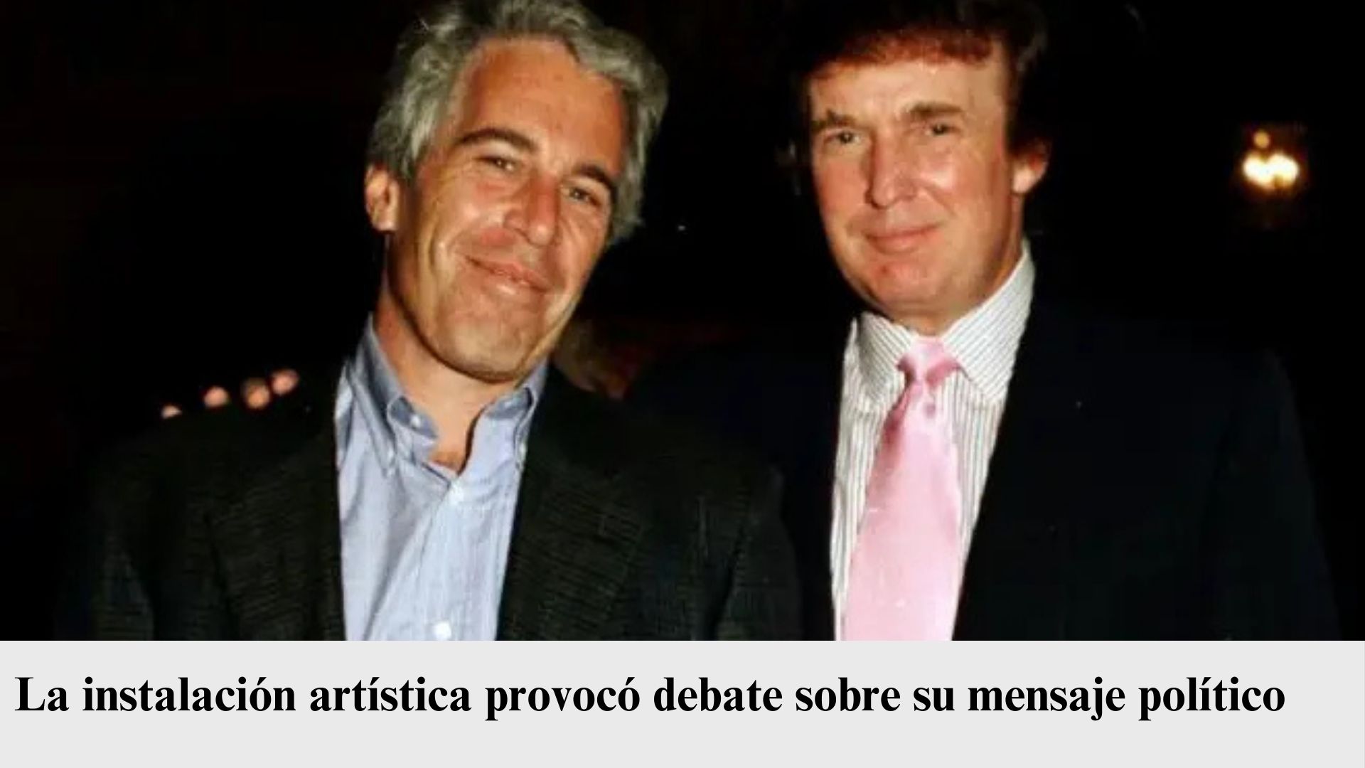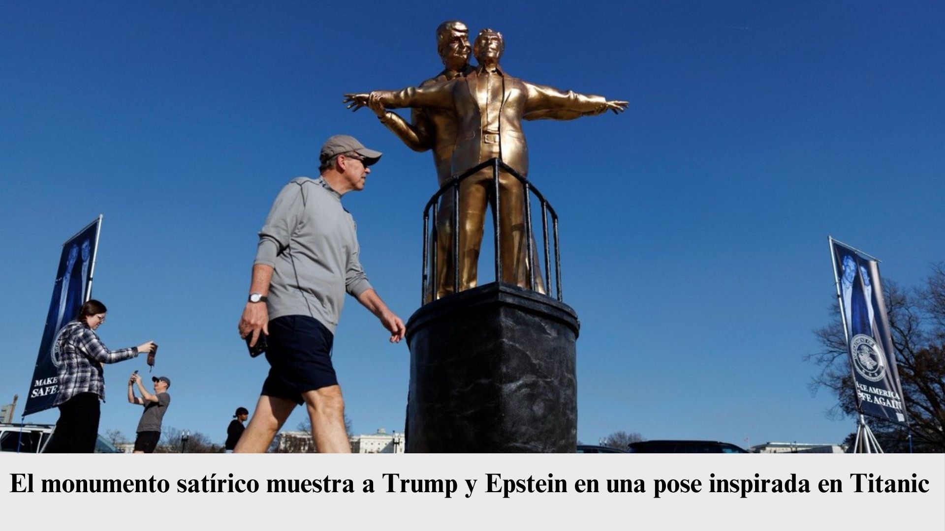 Una escultura con la figura del presidente Donald Trump junto al financiero Jeffrey Epstein apareció como parte de una protesta política en Washington, la obra titulada “King of the World” recrea la conocida escena en la proa del barco de la película Titanic, la instalación incluye una placa con un mensaje crítico que hace referencia a la relación social que ambos mantuvieron en el pasado.