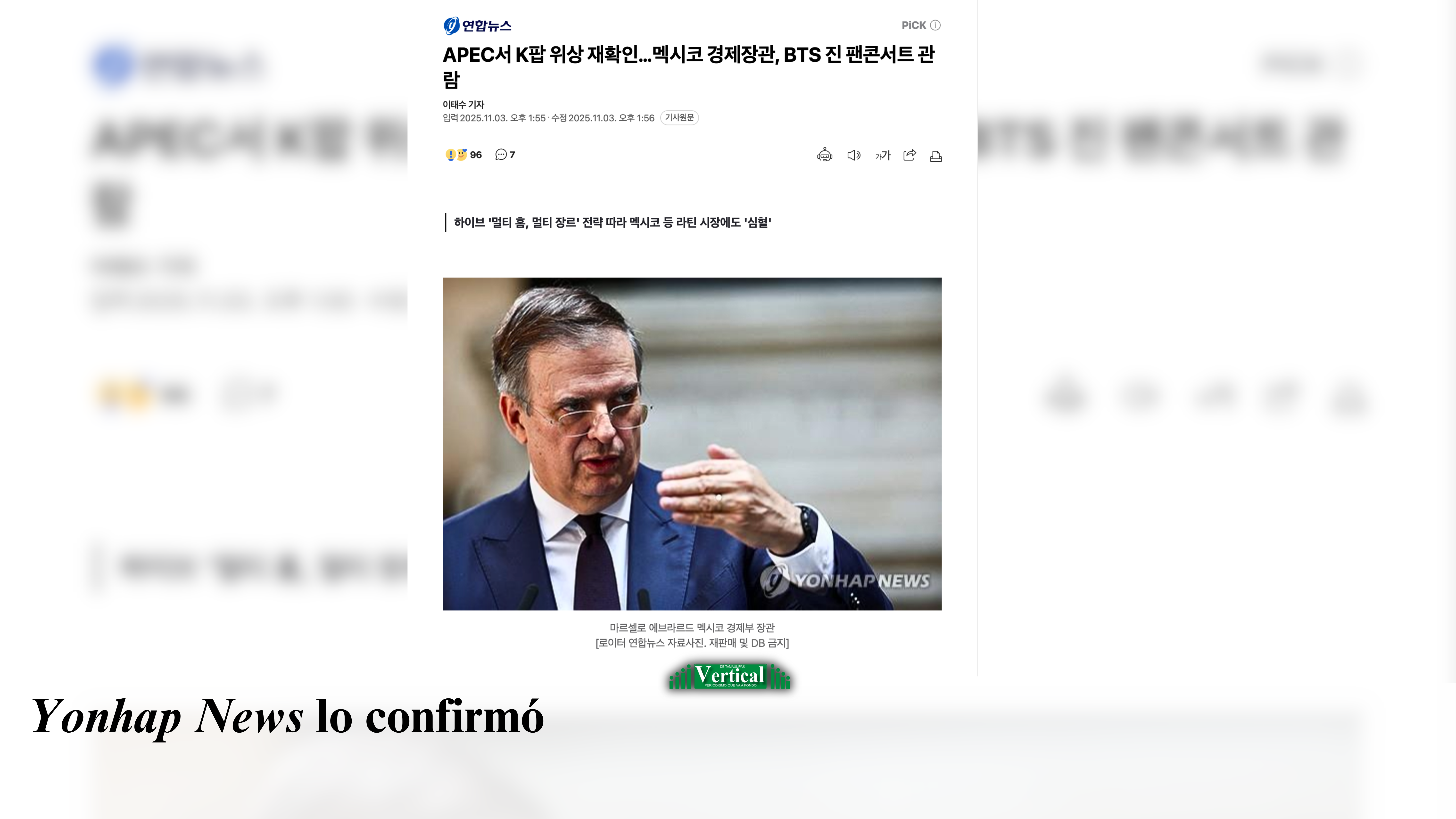 Medios coreanos e internacionales aseguran que el secretario de Economía, Marcelo Ebrard, asistió al concierto de Jin, integrante de la famosa banda BTS, el pasado 1 de noviembre, durante su visita a Corea del Sur para participar en la cumbre APEC (Cooperación Económica Asia–Pacífico) en representación de Claudia Sheinbaum. Aunque la información no ha sido confirmada oficialmente, portales como Times of India y el medio coreano Yonhap News difundieron reportes que dan por hecha su presencia en el evento.