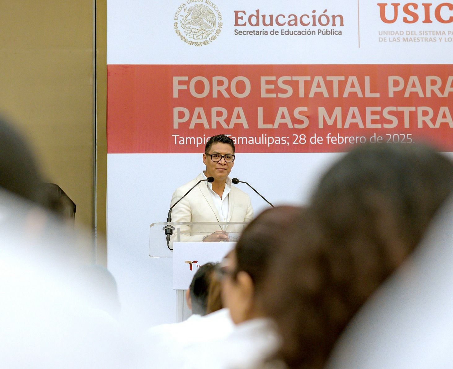En el marco del Foro Estatal para la Construcción del Nuevo Sistema para las Maestras y los Maestros realizado en el municipio de Tampico, el coordinador de asuntos jurídicos de la USICAMM del Gobierno Federal, Miguel Ángel Guerrero López, reafirmó el compromiso de la presidenta de México, Claudia Sheinbaum Pardo con las maestras y maestros de México y de Tamaulipas.