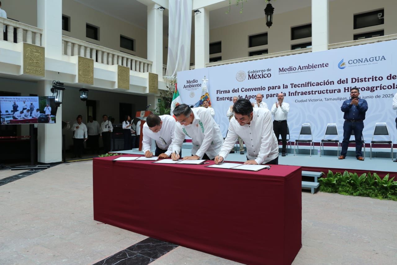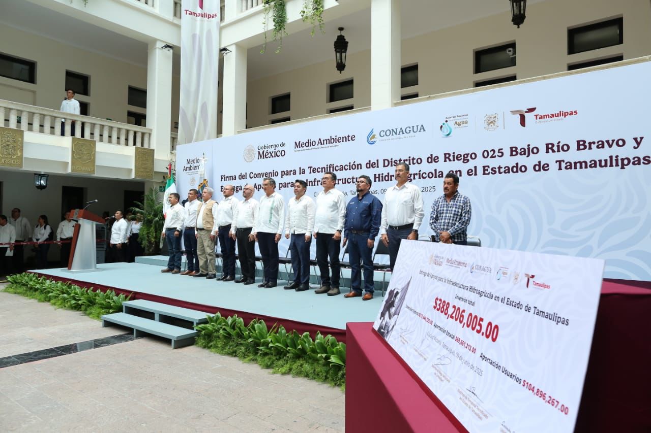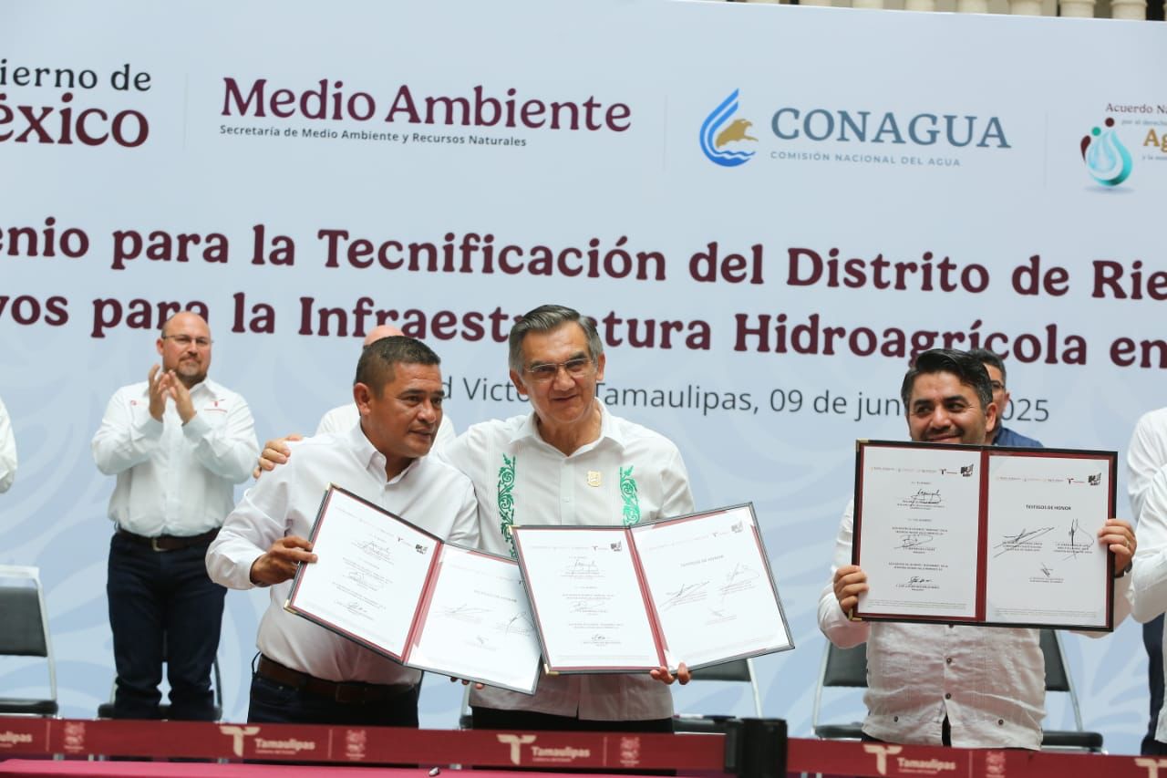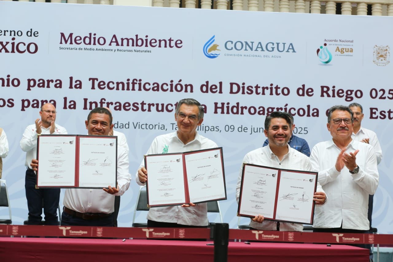 En un hecho histórico y trascendental para la modernización del campo tamaulipeco, y en cumplimiento de uno de los 100 compromisos establecidos por la presidenta de México, Claudia Sheinbaum Pardo, orientado a tecnificar más de 200,000 hectáreas para riego agrícola, este lunes se firmó el Convenio para la Tecnificación del Distrito de Riego 025 Bajo Río Bravo, por el director general de la Comisión Nacional del Agua (Conagua), Efraín Morales López, y el gobernador de Tamaulipas, Américo Villarreal Anaya. Además, se llevó a cabo la Entrega de Apoyos para la Infraestructura Hidroagrícola en el estado con un monto de 388 millones 206 mil pesos.