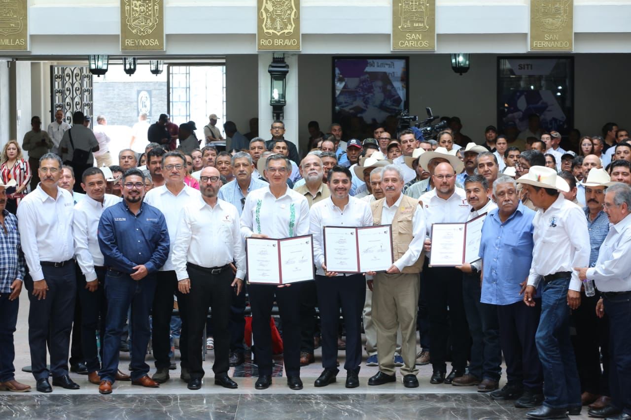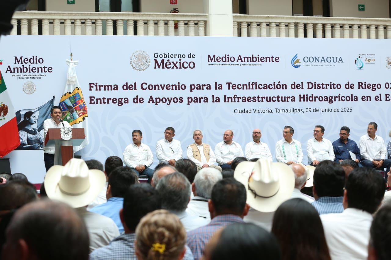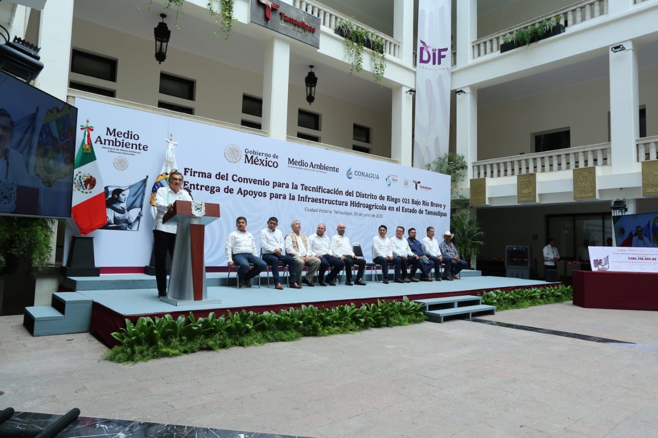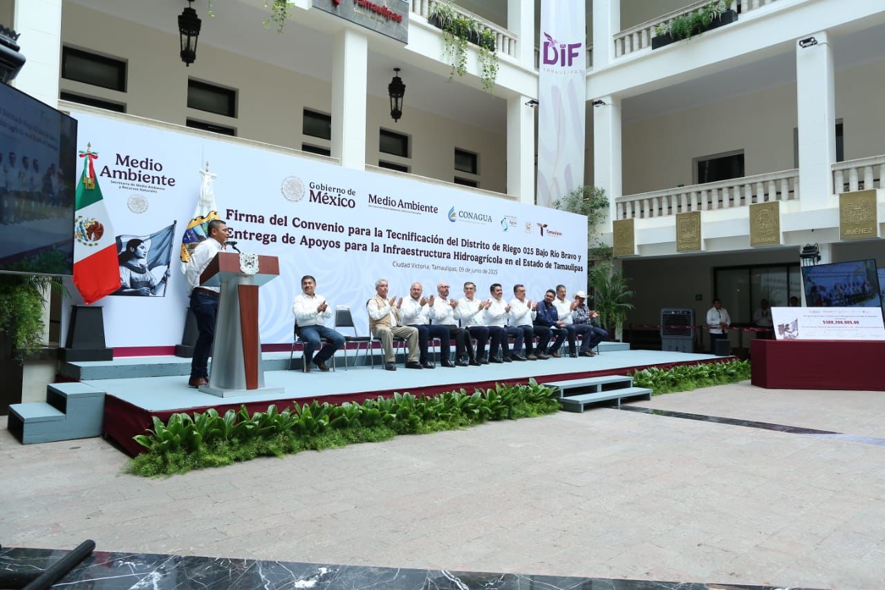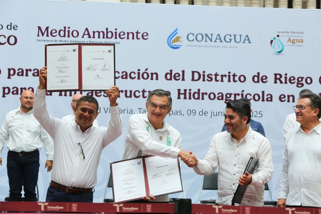 En un hecho histórico y trascendental para la modernización del campo tamaulipeco, y en cumplimiento de uno de los 100 compromisos establecidos por la presidenta de México, Claudia Sheinbaum Pardo, orientado a tecnificar más de 200,000 hectáreas para riego agrícola, este lunes se firmó el Convenio para la Tecnificación del Distrito de Riego 025 Bajo Río Bravo, por el director general de la Comisión Nacional del Agua (Conagua), Efraín Morales López, y el gobernador de Tamaulipas, Américo Villarreal Anaya. Además, se llevó a cabo la Entrega de Apoyos para la Infraestructura Hidroagrícola en el estado con un monto de 388 millones 206 mil pesos.