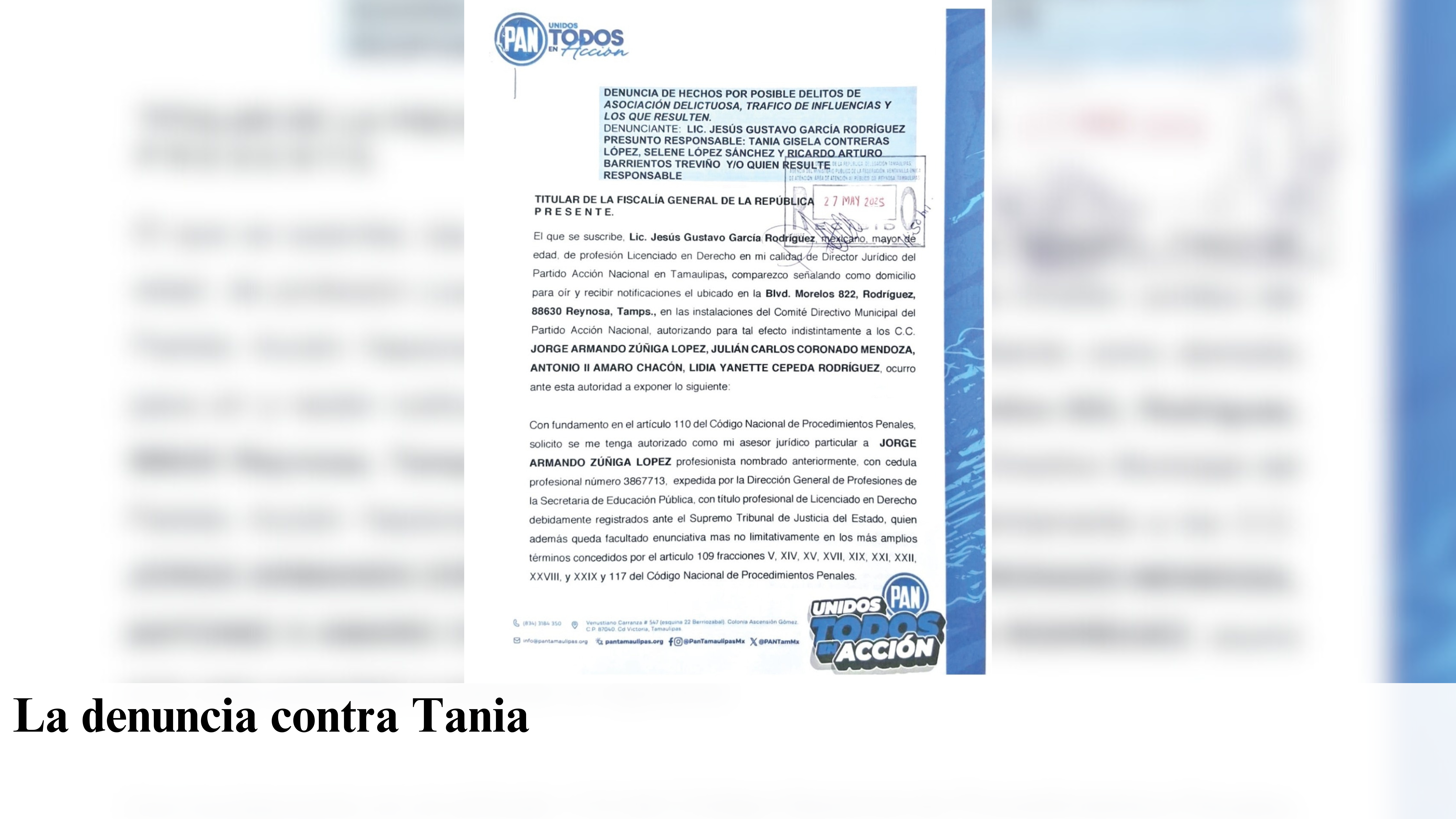 Luis René Cantú Galván, El Cachorro, presidente del PAN en Tamaulipas, junto con Jesús Gustavo García Rodríguez, asesor jurídico, presentaron una denuncia formal ante la Fiscalía General de la República (FGR) contra Tania Contreras, exconsejera del gobernador Américo Villarreal Anaya y su cuñado, Juan Carlos Madero Larios, exdirector del Centro de Operaciones de Aduanas, por delitos de asociación delictuosa, tráfico de influencias y los que resulten.